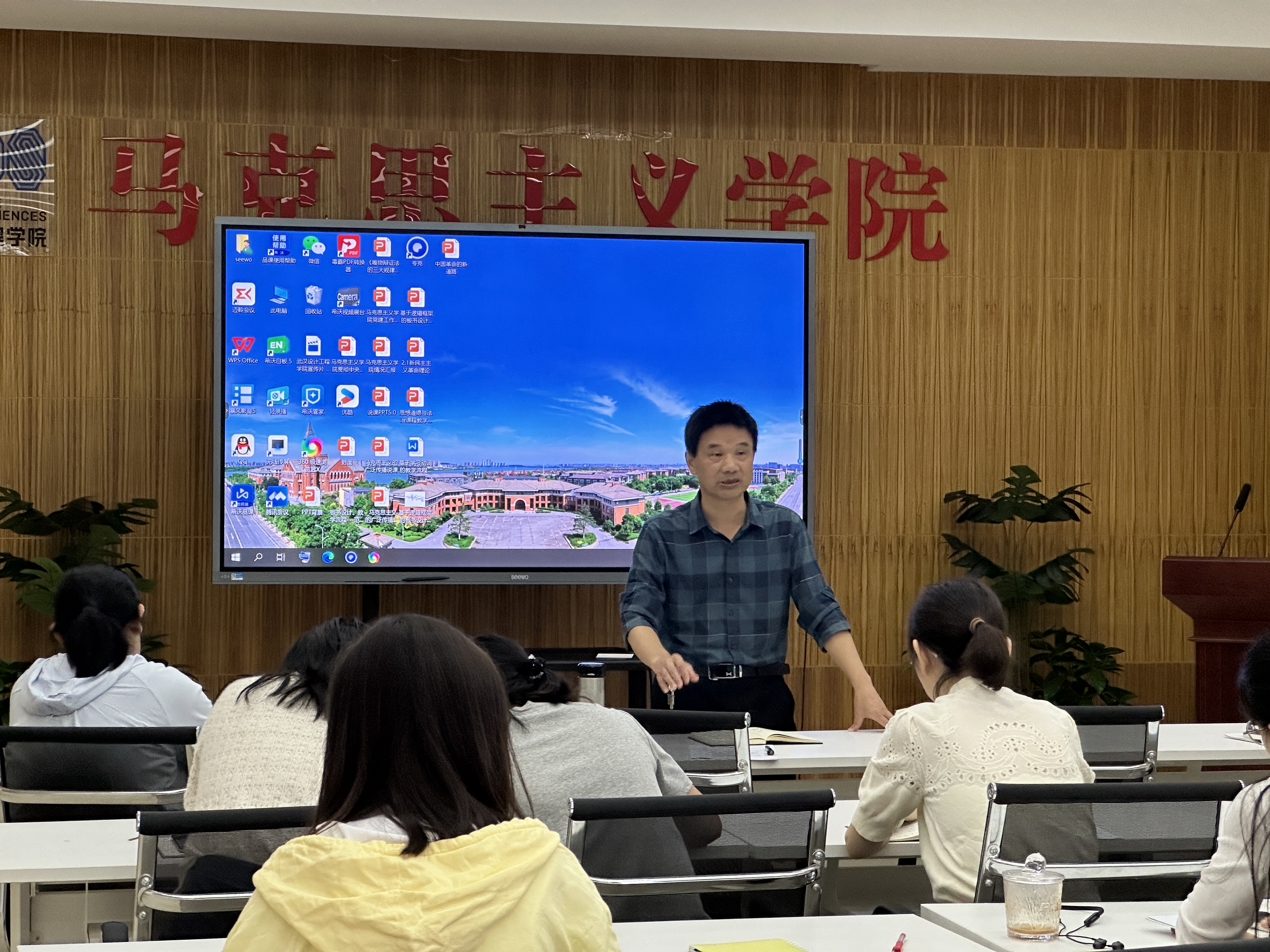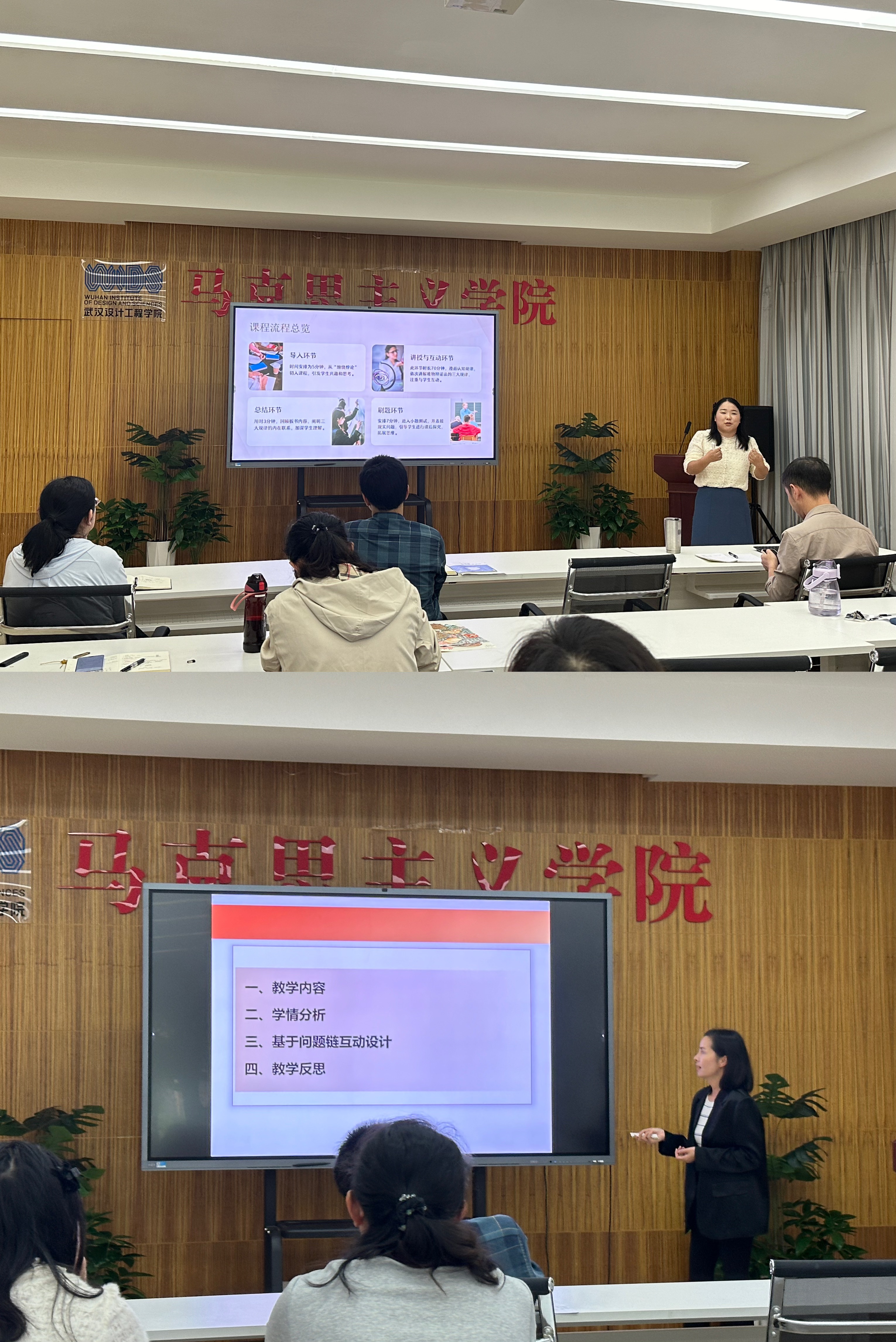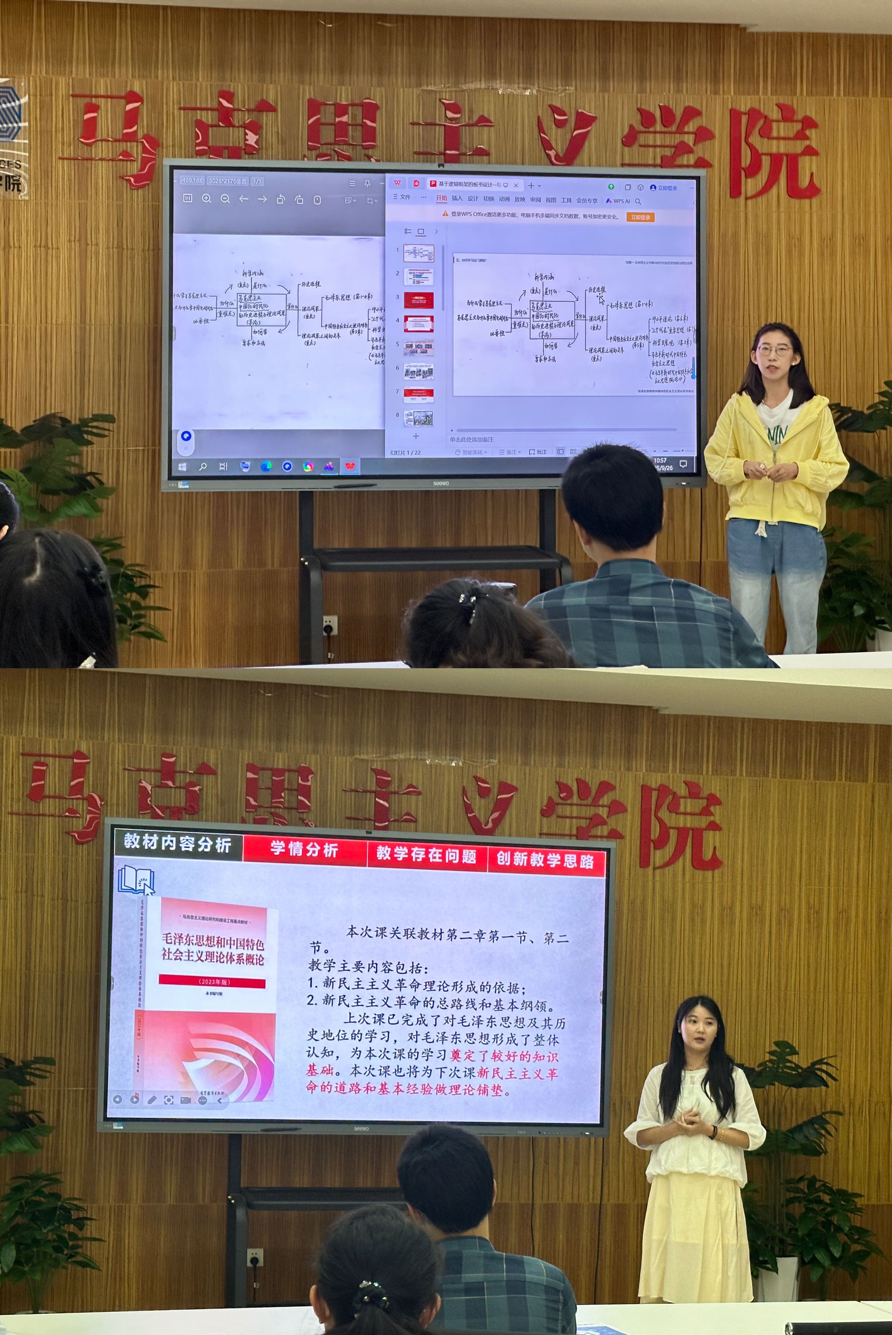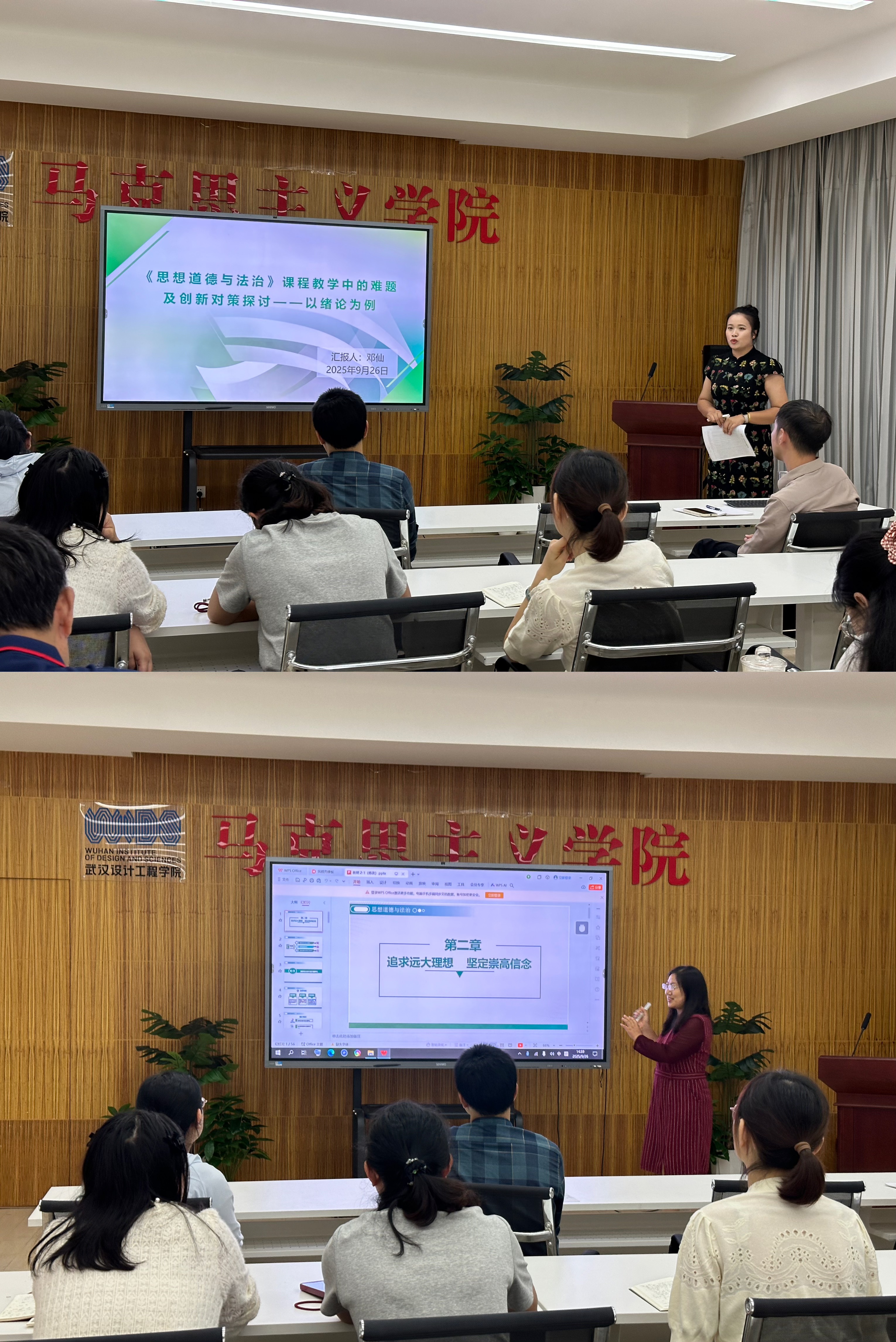 思想道德与法治教研室邓仙老师结合《绪论》部分,将基于逻辑框架的板书设计和基于学习动词的教学流程设计融入教学过程,力求提升教学效果。王凤玲老师则围绕第二章《追求远大理想 坚定崇高信念》,设计了基于问题链式的有效互动环节。